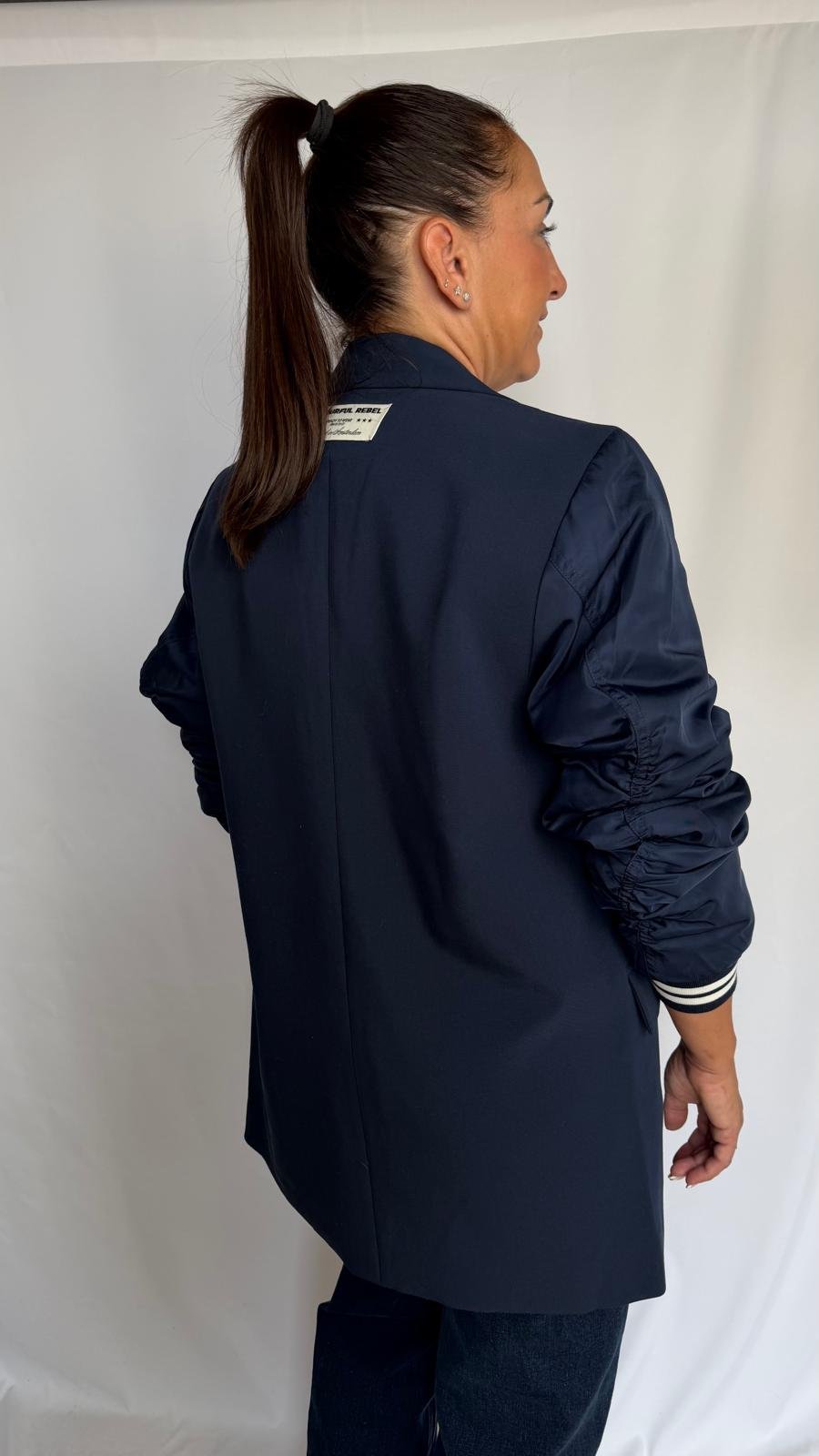 Blazer azul marino tipo bomber con mangas fruncidas